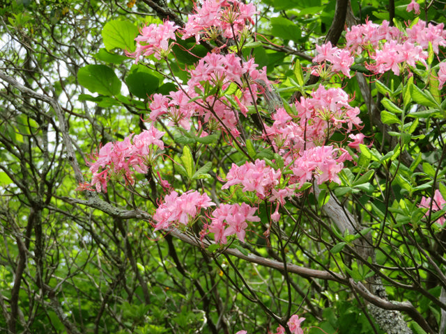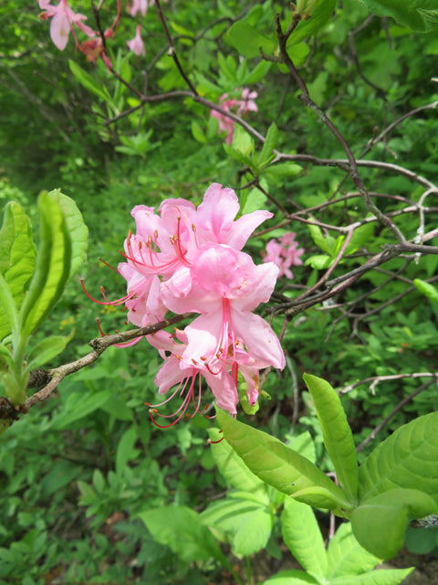 Roseshell Azalea, or Early Azalea, is a deciduous native shrub. It typically occurs on wooded slopes and ravines and along streams. Pink flowers appear in early spring before or at the time of the emergence of the foliage. Flowers (to 1.5" long) are in trusses of 5-9 flowers each and have a pleasant, clove-like fragrance. Bright green foliage (grayish woolly beneath) turns bronzish in fall. Extremely winter hardy (grows in the wild as far north as Quebec) and is one of the parents of the Northern Lights hybrids developed by the University of Minnesota. An upright, rounded shrub which typically grows 4-8' tall (less frequently to 15' tall) and as wide. Formerly known as Rhododendron roseum.