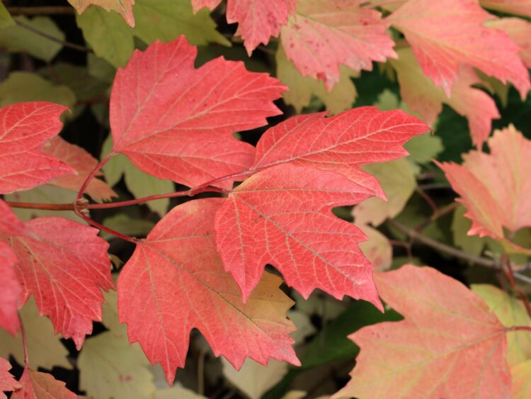 The distinctive, purplish-pink autumn foliage makes this one of our handsomest shrubs. Mapleleaf Viburnum is a low, densely branched shrub, 3’ to 4’ wide. Flat-topped clusters of white flowers are followed by berries turning from red to blue-black.