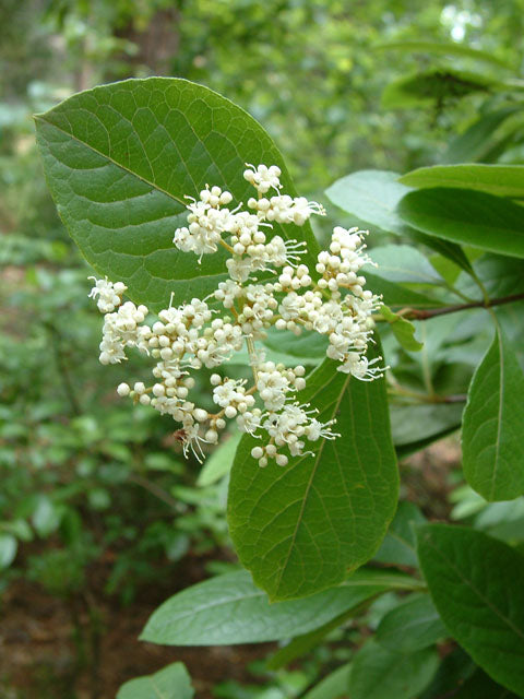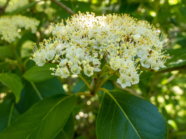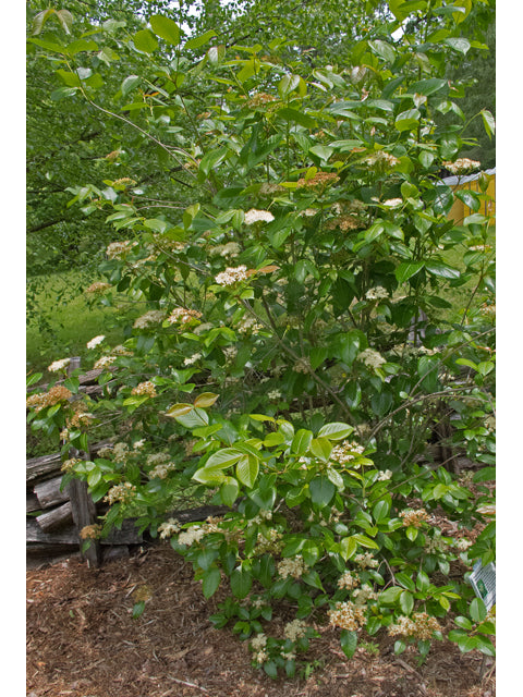A dense, 12-20 ft shrub with upright stems becoming arching with age. Flat-topped clusters of white flowers are followed by colorful summer fruit. Foliage is smoother and more lustrous than most viburnums and fall color is always good.