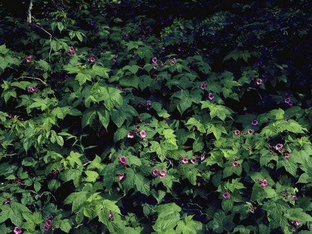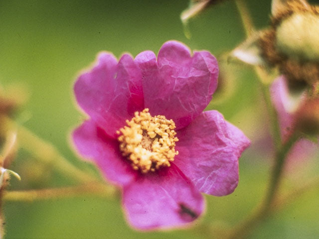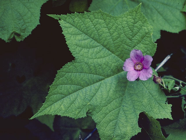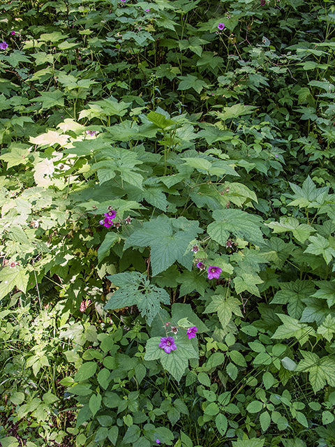 A suckering shrub, 3-6 ft. high and 6-12 ft. wide which forms broad patches. Five-lobed, maple-like, dark green leaves become pale yellow in fall. Large, pinkish-purple flowers occur singly or in few-flowered clusters. Fruit is a broadly rounded, red to purple berry. Canes are thornless, yellow- to orange-brown, and exfoliating. This erect, shrubby, thornless plant has rose-lavender flowers in loose clusters; new branches have bristly hairs. Grows in moist, shady places; woods edges.