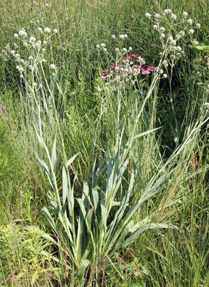 Use Rattlesnake Master in native gardens and prairies, individually or massed where the plants can provide support for each other. This plant works well as an accent in the perennial border, with the spiky leaves providing contrast in form and texture with many other garden ornamentals and the flowers adding architectural interest. It is a striking plant as a specimen rising above shorter plants, or in small groups and is right at home in a gravel garden. The plants provide interest in the winter landscape if not cut back at the end of the season.