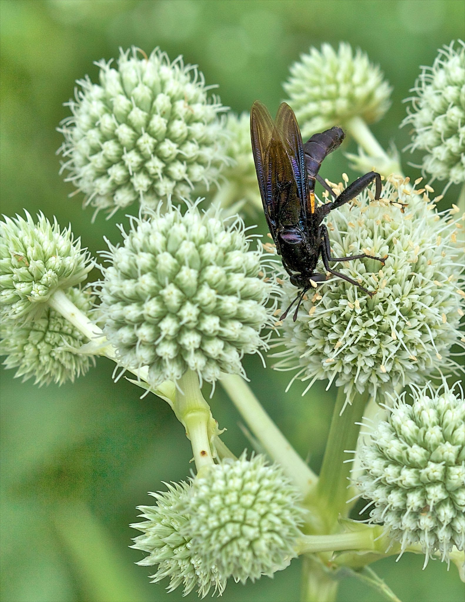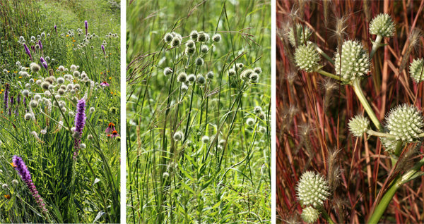 Rattlesnake Master is an herbaceous perennial recognizable by its unique “golf ball” flowers. Has medium green, bluish, or gray-green foliage. The narrow, sword-shaped leaves grow up to 3' long, forming a dense clump 2 to 3 feet wide. Each stiff leaf has parallel veins, bristly or spiny margins, and a pointed tip, reminiscent of a yucca leaf – hence the specific epithet. Unlike most members of the carrot family, the genus Eryngium does not have open, airy dome-shaped umbels but instead produces dense flowerheads with a thistle-like appearance. Plants bloom from mid to late summer with clusters of up to 10 white, green or bluish spherical heads.