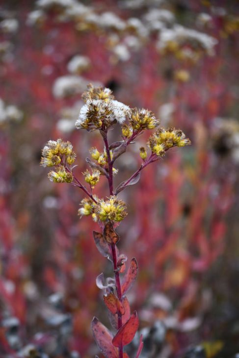 Stiff Goldenrod has larger, flatter flower clusters than most Goldenrods. The leaves turn nice shades of red in the fall. Another botanical name is Solidago rigida. The stout, unbranched stems of stiff goldenrod are 1-5 ft. tall and often occur in clumps. Each stem ends in a flat-topped inflorescence of yellow flower heads.